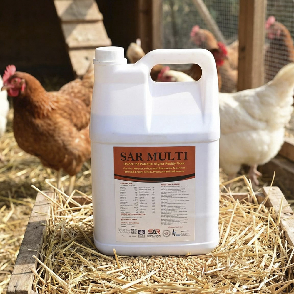 SAR MULTI prevents vitamins deficiencies and associated health issues. SAR MULTI should use in all conditions of Stress, Vaccination, Beak trimming catching, weight loss and transportation.